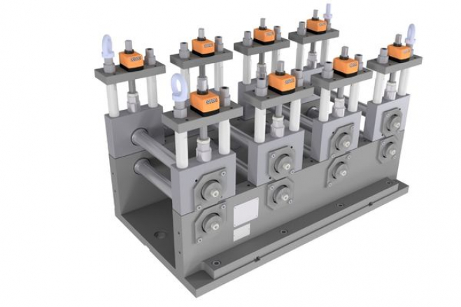 Den stora skillnaden ligger i den justerbara övre axeln, som enkelt regleras med en spindelskruv. En tydlig indikator visar axelns position, och vid leverans är indikatorn kalibrerad till "0" för att förenkla arbetet för operatörerna. Detta gör det möjligt att snabbt och exakt justera kassetten för olika material och produktionsförhållanden, vilket är särskilt värdefullt vid variationer i plåttjocklek eller sträckgräns.